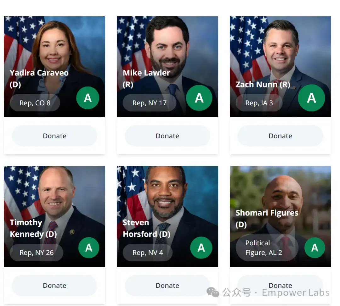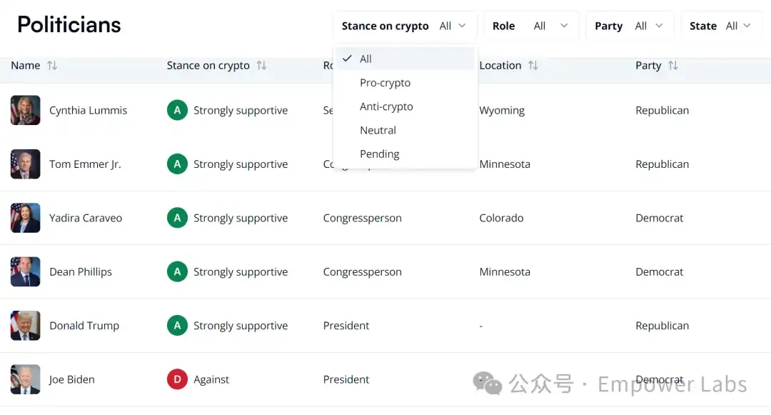 Standing with Crypto 的战略颇具创意,他们几乎照搬了 PACDAO 的做法,建立了一个详尽的政治人物加密立场评分卡。数据库中包含了一千位以上的政治人物,人们可以一目了然地了解每一位议员对加密货币的态度。
