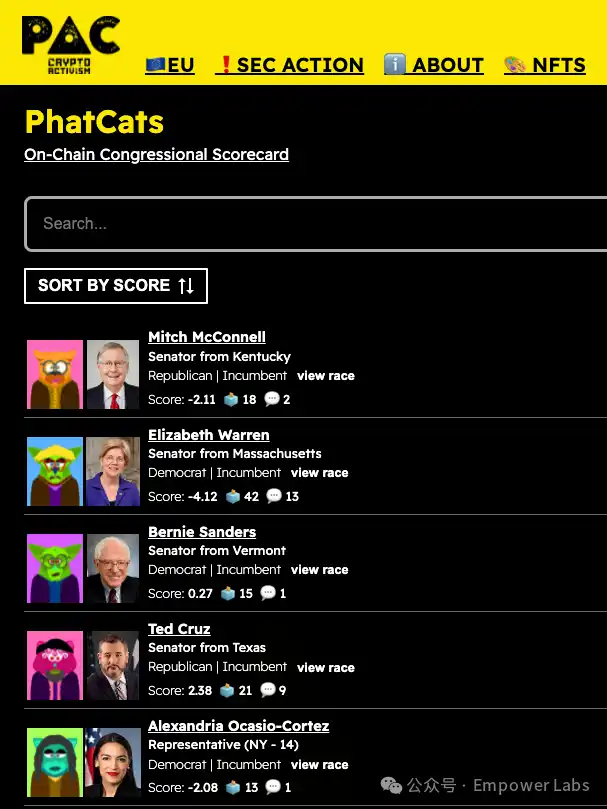 PACDAO 最引人注目的创新是建立了链上国会记分卡。社区成员可以对议员的加密友好度进行评分,结果将指导加密社区的政治支持方向。他们还根据评分为每位政治人物创建了可铸造为 NFT 的动画头像。