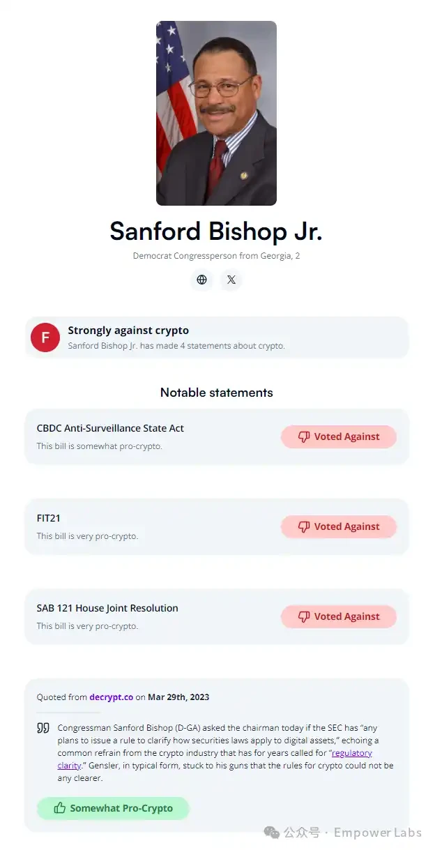 每一位议员的数据卡还包含了过去曾经在加密相关提案上投的什么票。