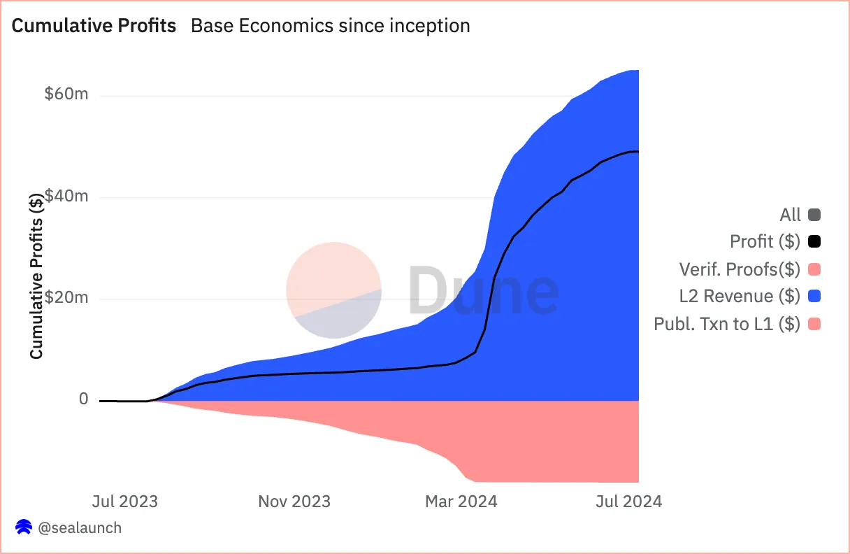 例如,如果链 A 和 BASE 各收取每笔交易 1 美元,链 A 通过捆绑 50 笔交易赚取 50 美元,而 BASE 通过捆绑 100 笔交易赚取 100 美元。如果两者都支付 50 美元给以太坊进行交易,链 A 仅能保本,而 BASE 则净赚 50 美元。这种效率使 BASE 能够通过有效捆绑更多交易来最大化收入。