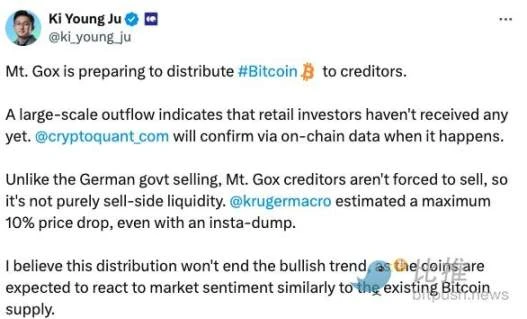 他在 X 帖子中解释道:「我相信这种偿还不会结束看涨趋势,因为预计这些代币对市场情绪的反应与现有的比特币供应类似。与德国政府抛售不同,Mt.Gox 债权人没有被迫出售,因此这不是纯粹的卖方流动性。」