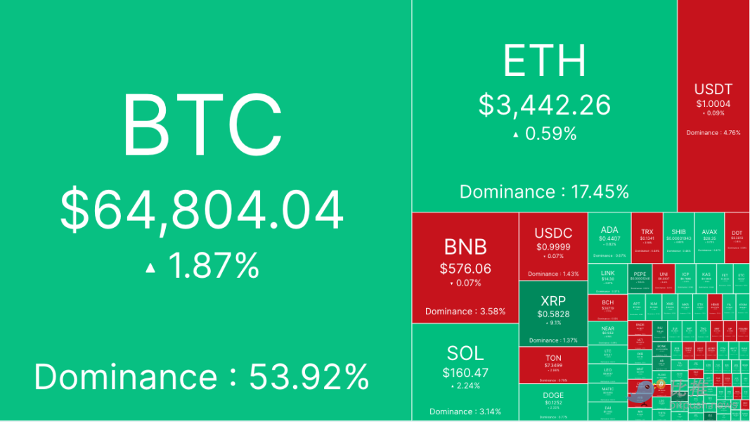 加密市场方面,比推数据显示,比特币盘中创下四周来的最高价格,自 6 月底以来首次飙升至 65, 000 美元以上,截至发稿时,交易价格为 64, 804 美元, 24 小时涨幅 1.9% 。