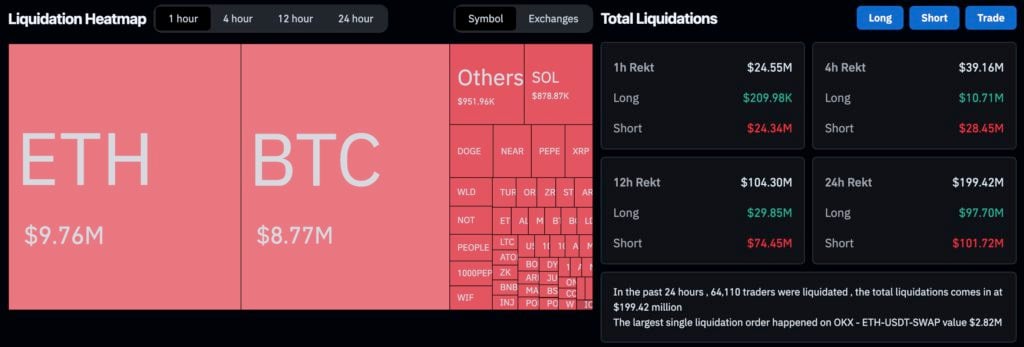 比特币拉涨的行情下,据 Coinglass 数据 显示,过去 24 小时,加密货币全网爆仓金额已近 2 亿美元,有超 6.4 万人遭清算(多、空军各自约占 1 亿美元)。