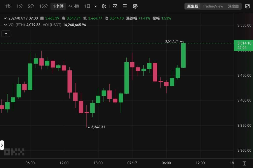 以太坊走势也与比特币接近,截稿前最高来到 3,517 美元,近 24 小时上涨 1.03%。