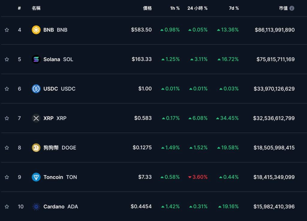 比特币拉涨趋势下,其他前十大代币也同步上扬。近 24 小时涨幅最多的是 XRP 超 7%;不过近期的黑马公链 TON 则是逆势下跌了 3.6% 报 7.33 美元。