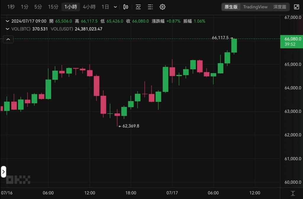 且后来社群有截图流出,表示已经收到 Kraken 信件,表示他们已收到 Mt.Gox 偿还债权人的款项, 将会在未来一到两周内𫔭始支付 ;但或使是分发还需要一点时间、又或者是市场看好川普能继续拉抬 BTC…撰稿当下比特币正好突破 6.6 万关卡,最高来到 66,117 美元。