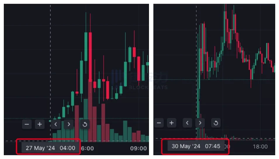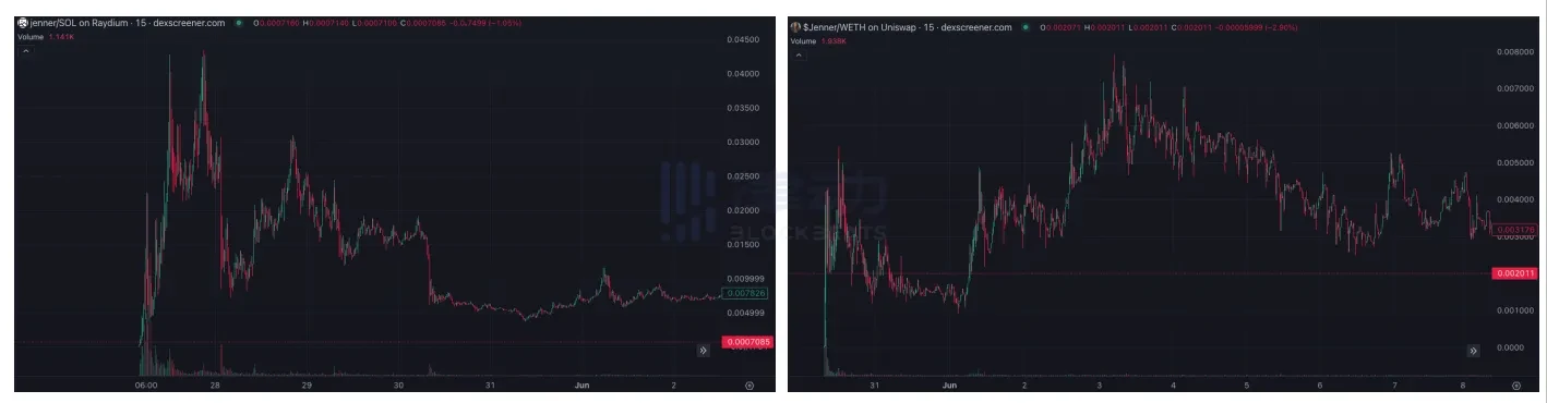 JENNER 在 Solana 上仅用一晚就实现了 160 倍的涨幅,但仅发币 3 天后就有明显的归零趋势。而以太坊上的 JENNER 在释出 3 天后达到区域性高点,随后 6 月 11 日,即发币后的一个多星期仍能达到 0.007 美元的价格突破新高,此后也依旧在 0.005 美元上下维持了数周,直到 7 月初才𫔭始有明显下降趋势。