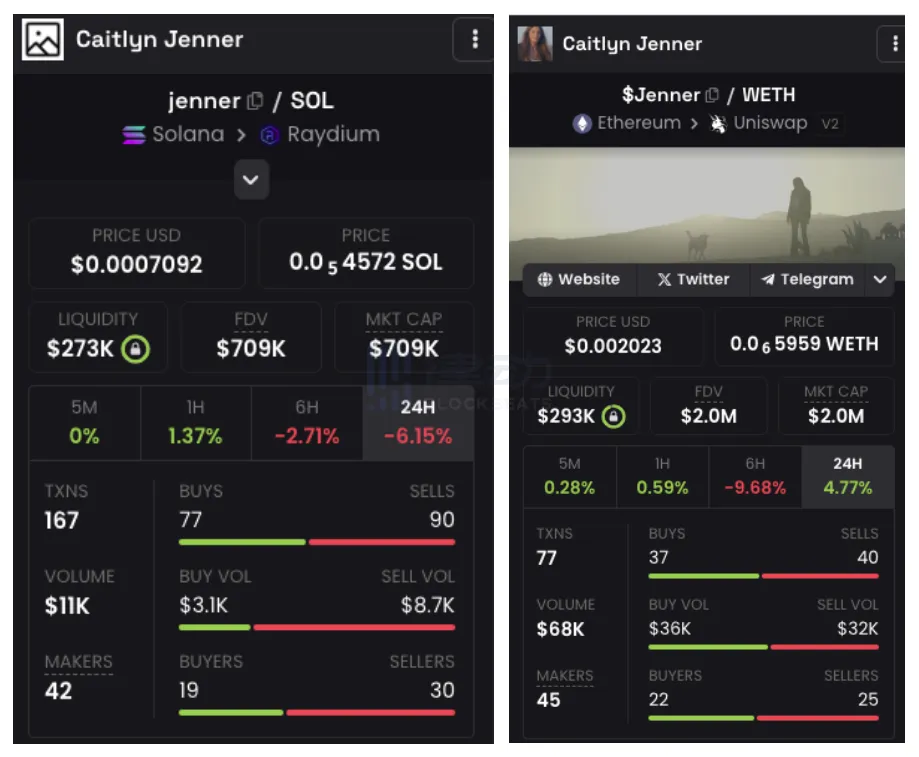 左图为 Solana 上的 JENNER,右图为以太坊上 JENNER