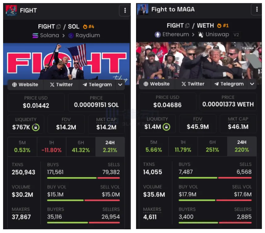 7 月 14 日,川普在一场竞选集会中演讲时耳部中枪,在被安保掩护的过程中还高举右拳并高呼「Fight」,在新闻释出后仅 15 分钟,Solana 上就涌出了 24 枚 FIGHT,其中涨势最好的 FIGHT 释出于 14 日上午 6:50。而以太坊上的 FIGHT 虽数量与 Solana 相当,但最早出现的 meme 于 14 日上午 9 点,较 Solana 慢 2 个小时。