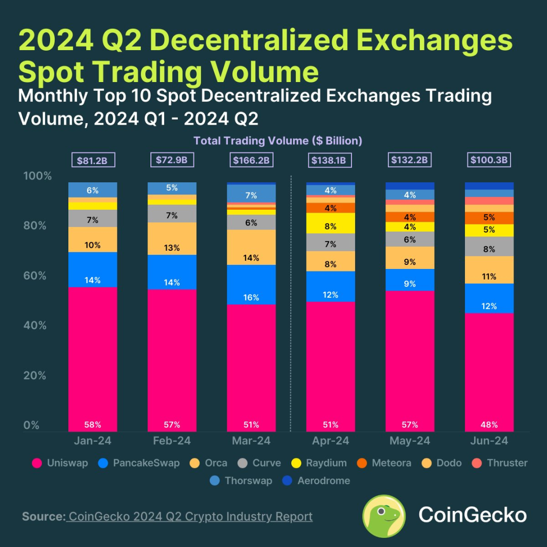 Uniswap 以 48% 的市场份额领先,Thruster(Blast 上的 DEX)交易量飙升 464% 至 60 亿美元,而 Aerodrome 增长 294.7% 至 59 亿美元,各占据 3% 的市场份额。