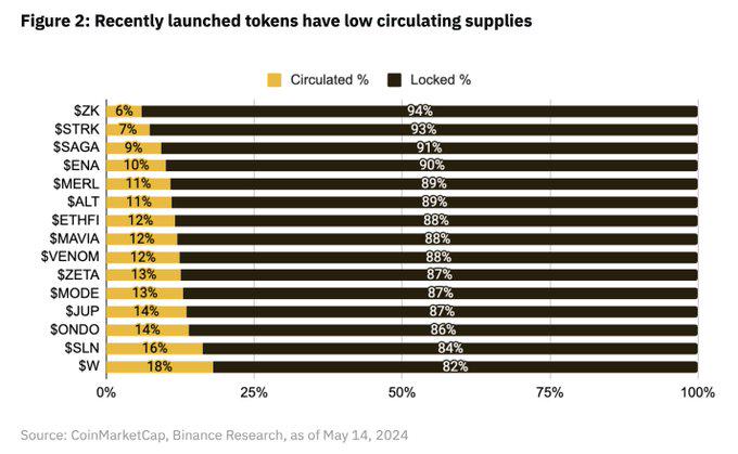 2024 年空投面临的另一个问题是,许多新协议广泛采用了「低浮动、高 FDV」的代币模型。这种模式使新买家难以看到代币的增长潜力,消耗不了空投带来的抛压。