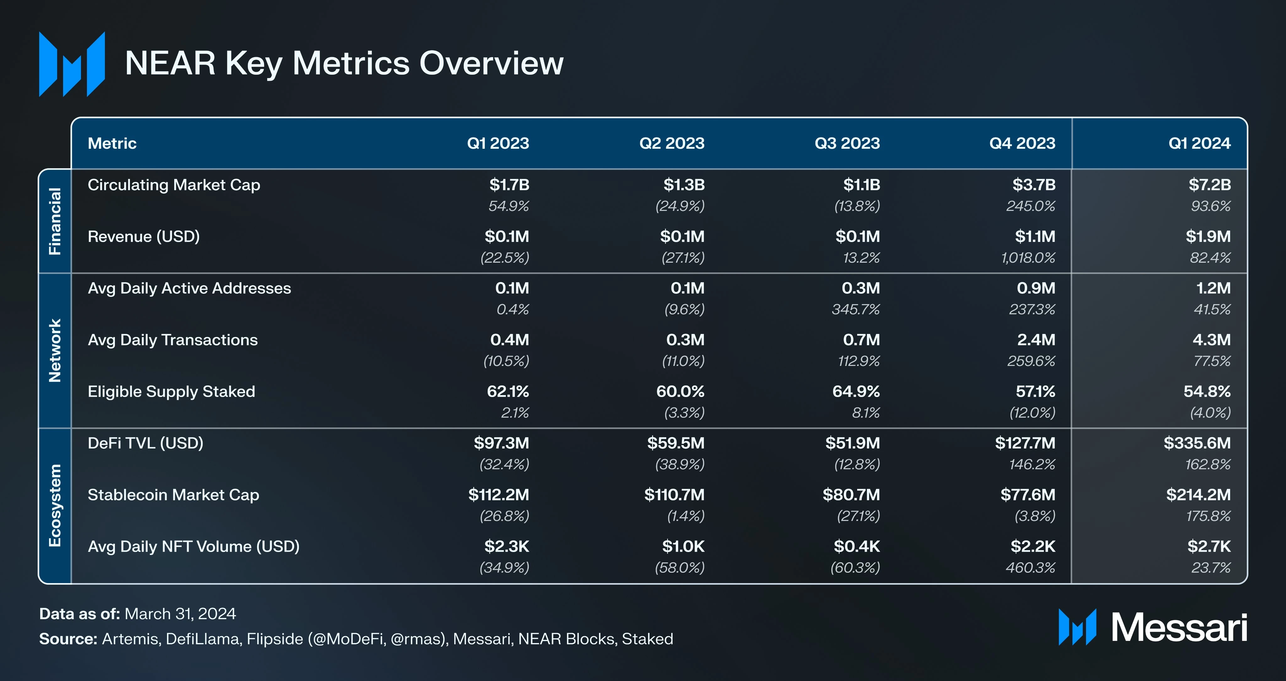 根据 Messari 调研数据,NEAR Protocol 是 2024 年Q1最大的赢家之一。NEAR 第一季度 TVL 为 3.35 亿美元,环比增长 163%, 较前六个月增长 547%。 日活跃地址数为 120 万,环比增长 42%, 较前六个月增长 377%。 NEAR 的稳定币市值环比增长 176%, 达到 2.14 亿美元。NEAR 累计账户总数超过 1 亿个。
