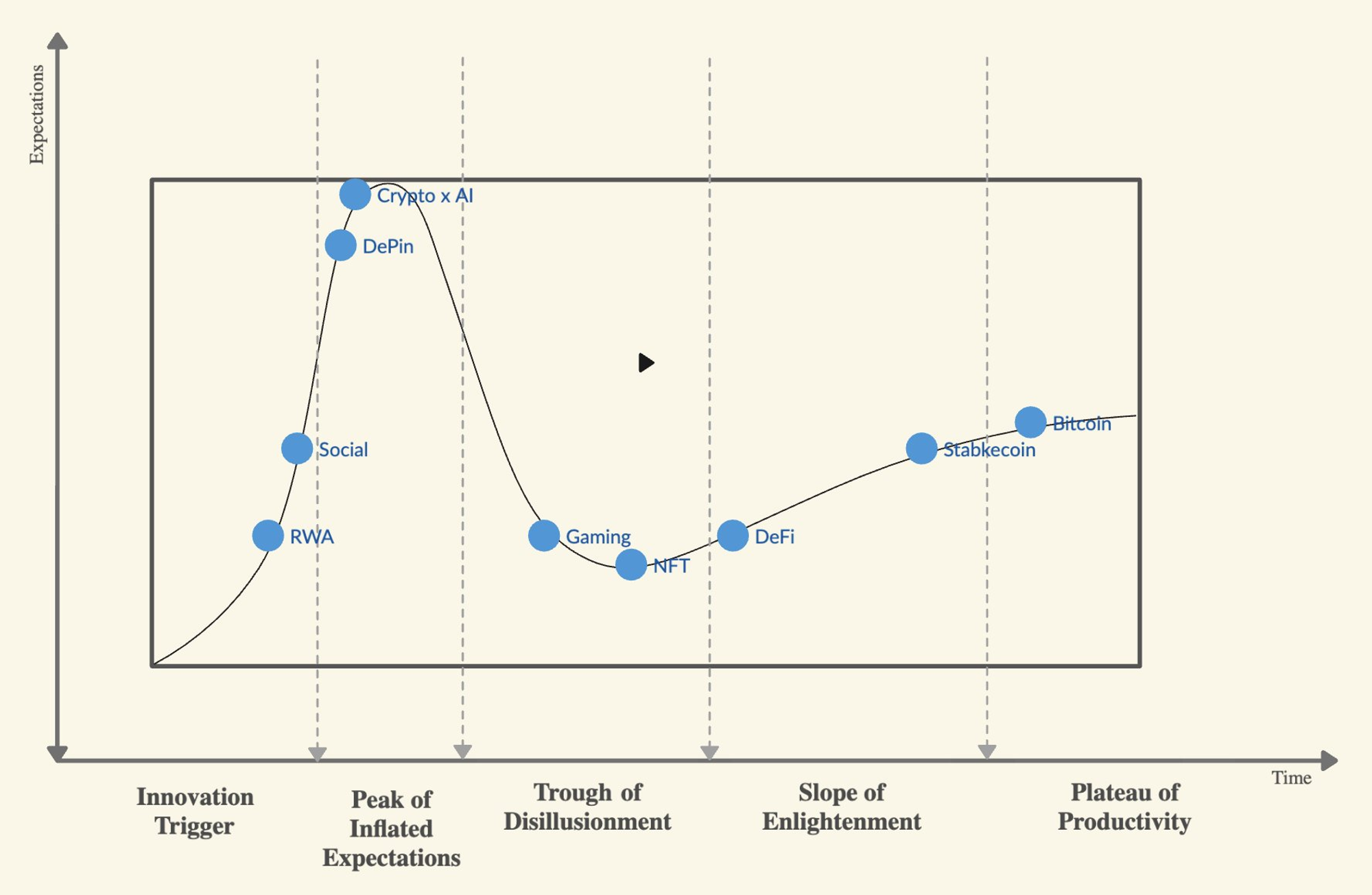 另一方面,对于更广泛的用户群体来说,在一些领域的应用还很有限。NFT 似乎正在经历一场「幻灭」。在经历了 2021 年的牛市之后,除了少数几个核心 IP 外,大多数 NFT 项目都未能获得社会的青睐。此外,即使市场对游戏寄予厚望,但该赛道的成绩也不容乐观,大受用户冷落。至于其他赛道,如人工智能、DePIN 和社交,要么尚未达到炒作的顶峰,要么刚刚处于创新的起步阶段。