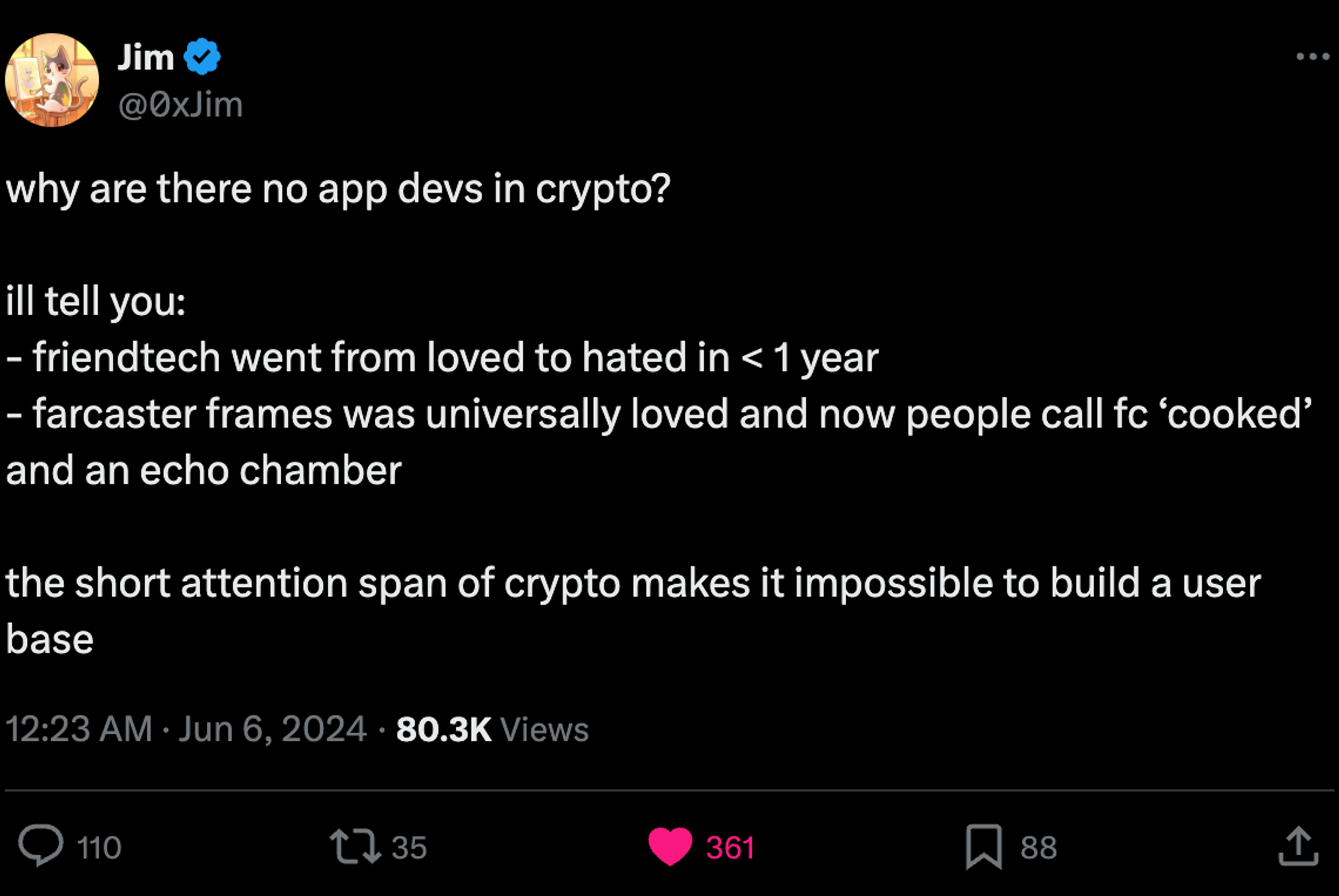 如前所述,加密货币行业一直存在对新叙事的市场需求,这种倾向在价值积累集中在 协议层 的 Web3 环境中尤为强烈。因此,几乎是出于惯性,行业继续表现出对平台和基础设施的偏好,应用的出现相对滞后,对用户的影响也被低估。