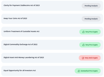 StandWithCrypto 跟踪的「key bills」 。它完全没有试图评判政治家在密码学和加密货币之外的技术方面的自由。