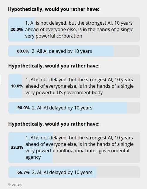 出现分歧的一种方式是,如果去中心化(decentralization)和加速(acceleration)的目标出现分歧。去年,我做了一系列民意调查,主要是询问人们在人工智能的背景下,他们更看重这两者中的哪一个。结果显然有利于前者: