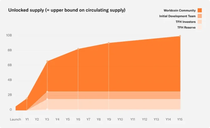 根据原有释放计划,TFH 团队和投资者将每日解锁 319 万枚代币,当前价值约 744 万美元,修改后的每日解锁降为(319 × 80% ÷ 2+ 319 × 20% )= 191.4 万枚,而 Worldcoin 公告给出的资料是每日解锁约 200 万枚。