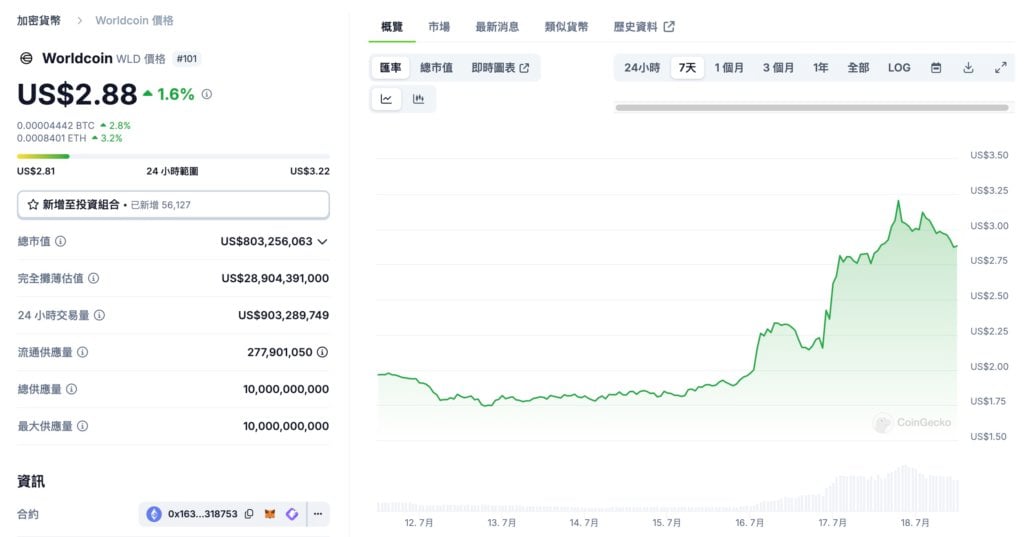 世界币一周跳涨46%!WLD大幅延长代币解锁时间、World Chain上缐在即..