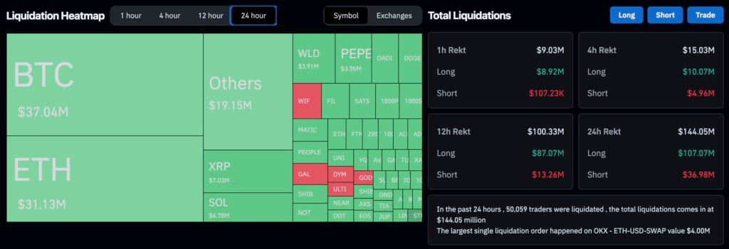 据 Coinglass 数据 显示,过去 24 小时,加密货币全网爆仓金额超 1.44 亿美元,有超 5 万人遭清算(多头占 1.07 亿美元)。
