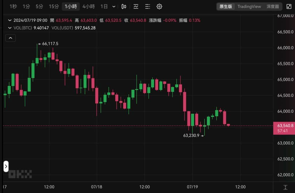 比 特币昨日回弹上 6.4 万美元之后盘整了一段时间,但于晚间九点之后又继续下挫,今(19)日清晨三点之后一度下杀 63,230 美元。