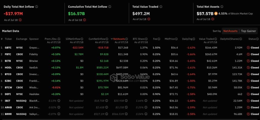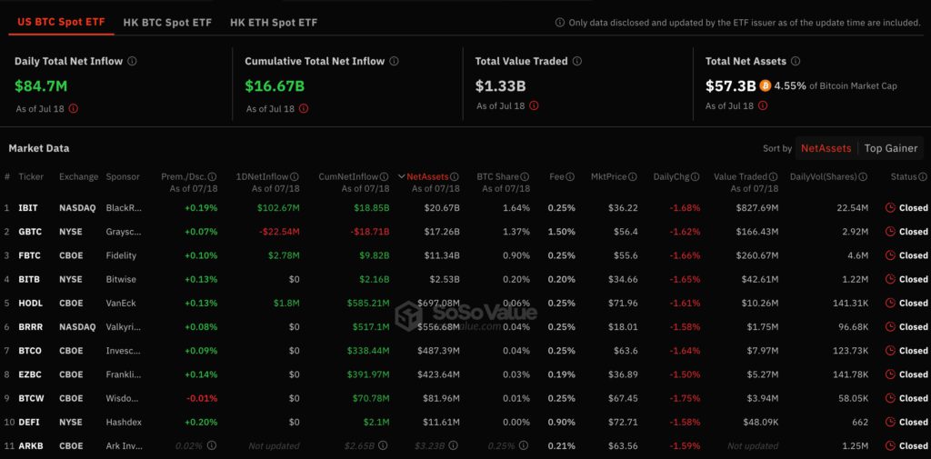 15:00 更新》贝莱德的 IBIT 纪录破一亿美元的流入,成功让 7/18 的资金流入成正数。