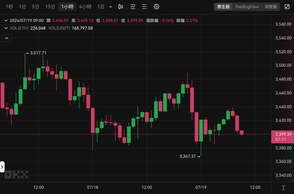 以太坊清晨最低也下探 3,367 美元,走势虽与比特币接近,但或许是看好下周现货 ETF 有望通过,跌幅相对来说较小。截稿前缐报 3,399 美元,近 24 小时下跌 0.36%。