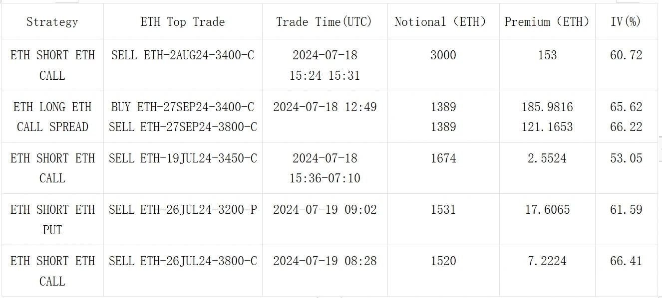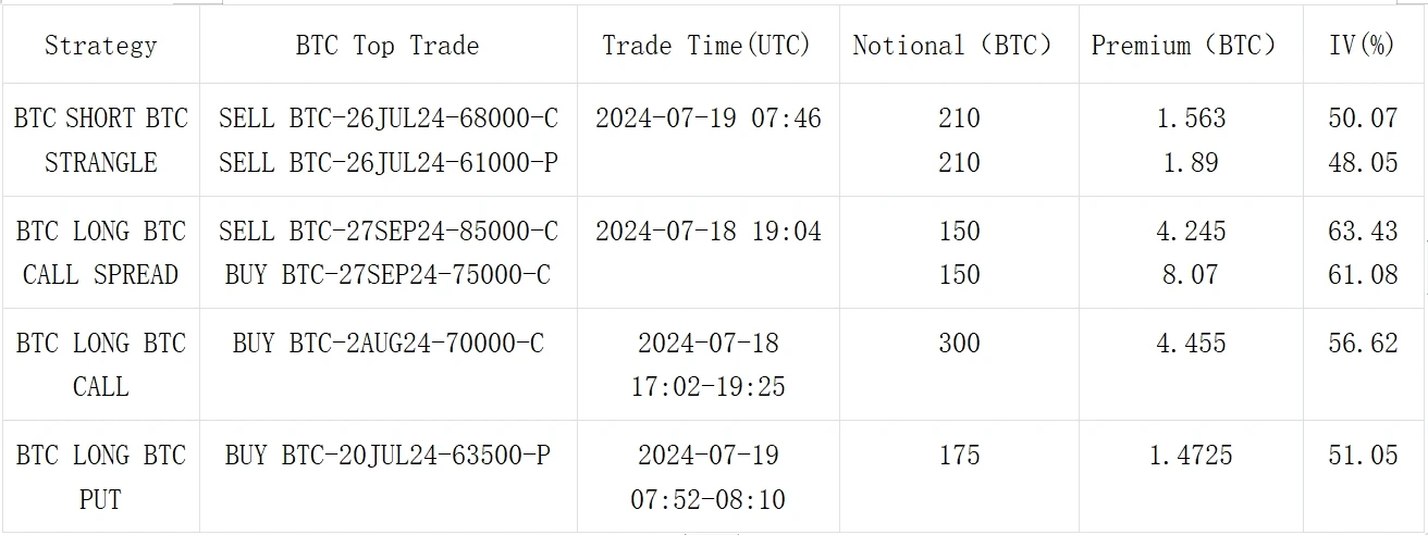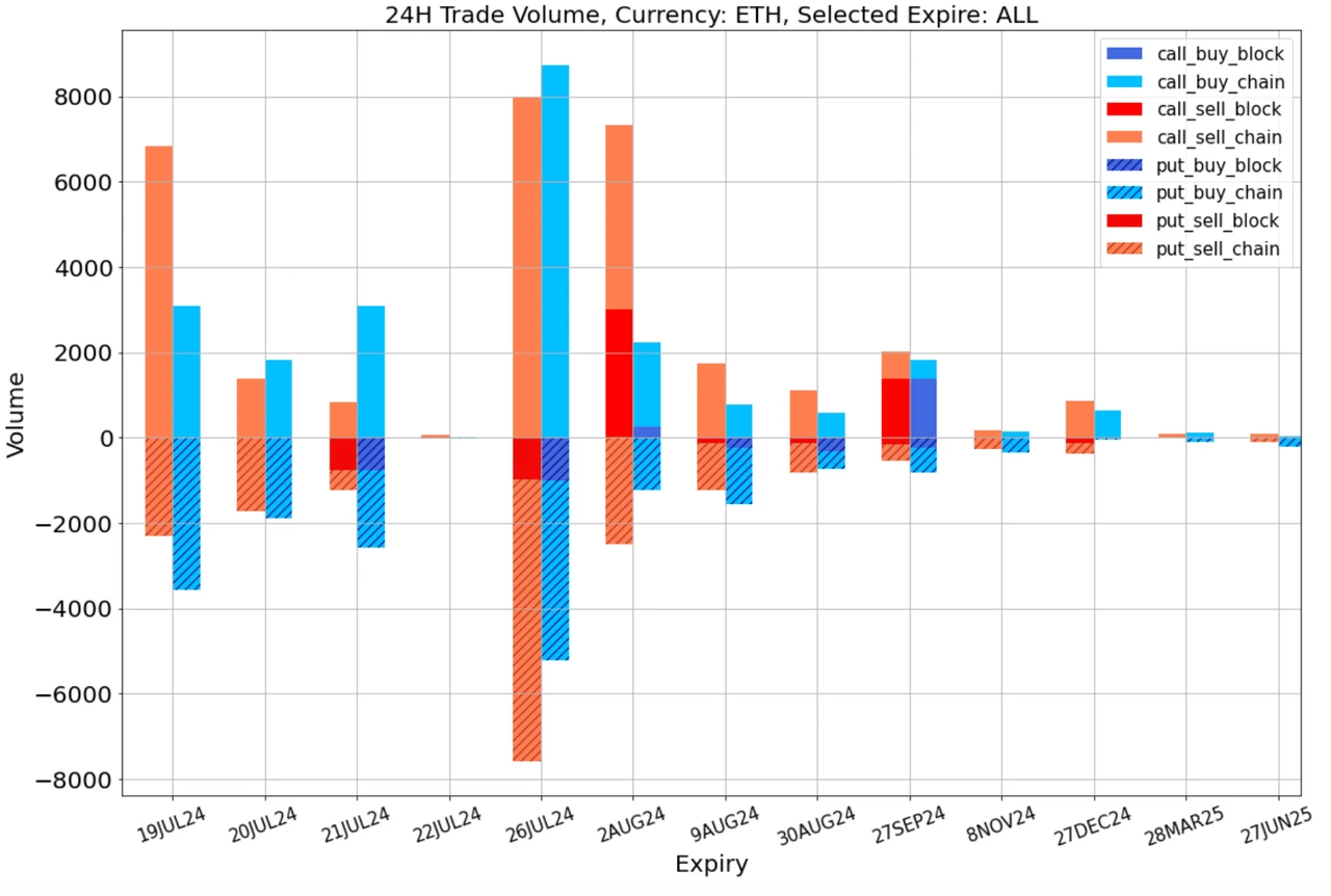 最后,我们也注意到 2 AUG 24 的 vol skew 与周边期限相比形成了局部高点,然而 BTC 和 ETH 在该到期日上的交易却大相径庭,BTC 70000 C 被大量买入,而 ETH 则是在 3400 C 的位置遭到强力的抛售压力。