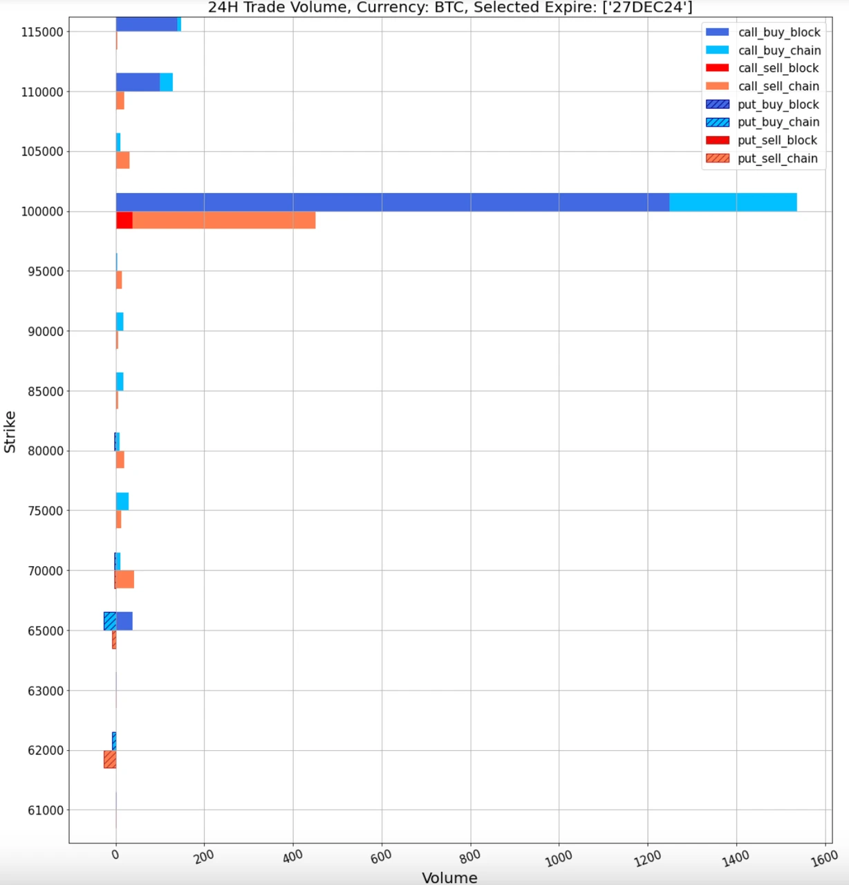 期权方面,整体隐含波动率水平自昨天大幅回落之后表现相对稳定,但仍处在近期高位。值得关注的变化有三点,首先是 BTC 十二月底的 IV 和 RR 都明显走高,或是受到该到期日在 Deribit 市场上大量买 100000-C 的 Flow 影响(见下图)