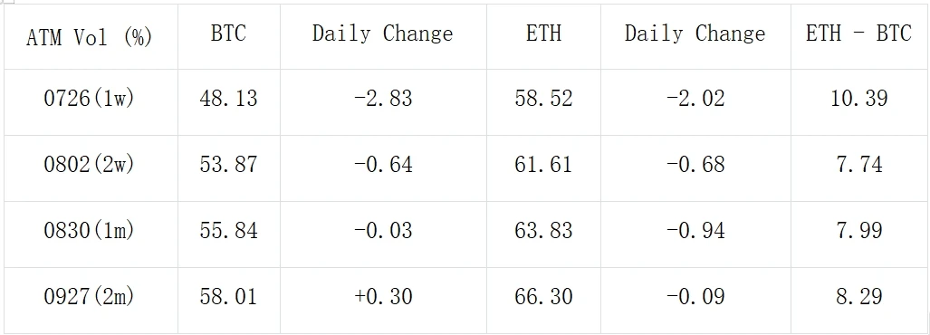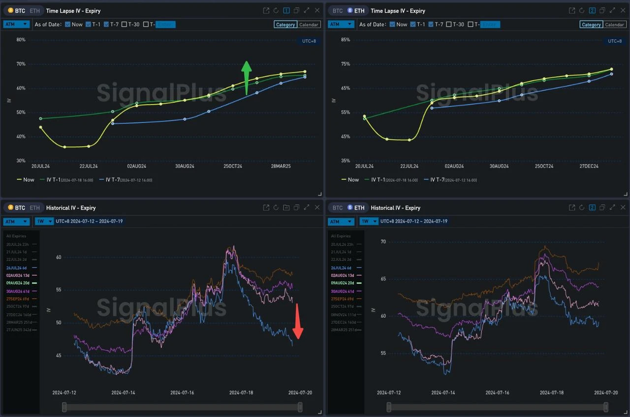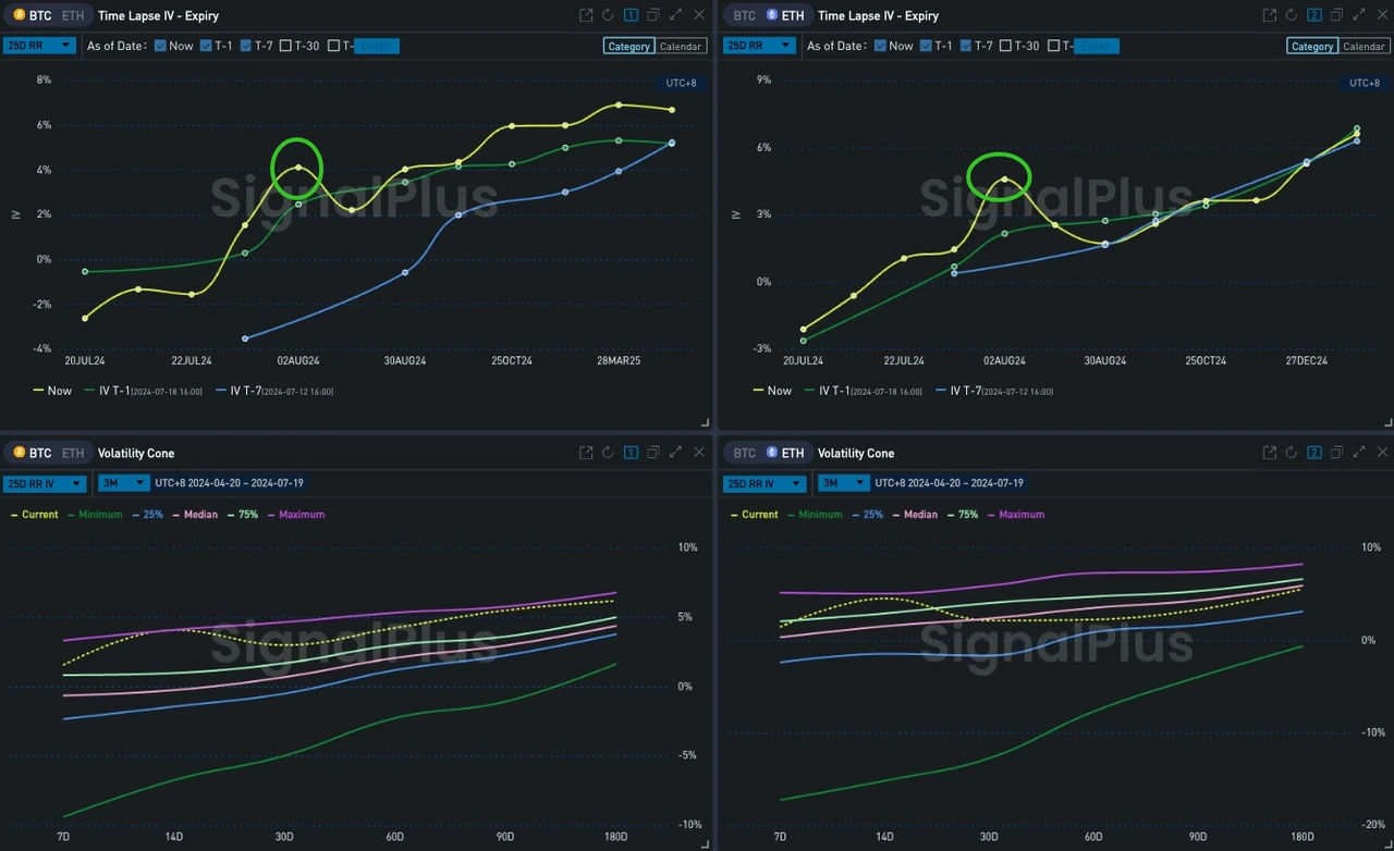 其二是 BTC IV 期限 Curve 走陡的变化相较于 ETH 更加明显,同样是对比七月底和其他更远端的到期日,BTC 到期日之间的差距更为显著,为跨期波动率对冲提供了较好的工具。