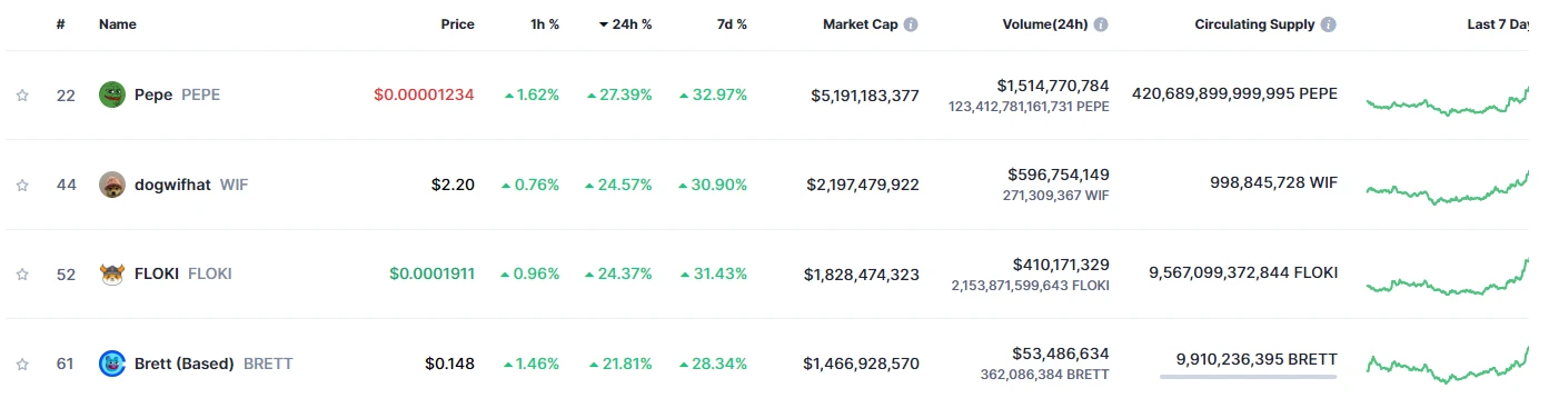 根据 CoinMarketCap 7 月 17 日的数据, 在市值排名前 100 的加密货币中,当天 24 小时涨幅排名前四的币种分别是 PEPE、WIF、FLOKI 和 BRETT,这些都是 Meme 板块的代币。显而易见,当市场回暖甚至有反转迹象时,Meme 板块的山寨币往往表现出最高的涨幅。因此,经过小幅度回调后,除了市值较高的 Meme 币之外,这一板块还有哪些值得关注甚至“上车”的币种呢?
