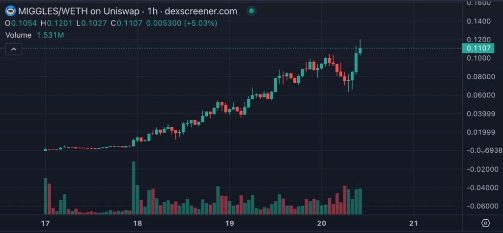 动区更新,目前 $MIGGLES 的币价已经来到 0.1107 美元,再度刷新历史新高、市值正式突破 1 亿美元。距离𫔭盘价(0.00004 美元)已经来到惊人的 3000 倍。