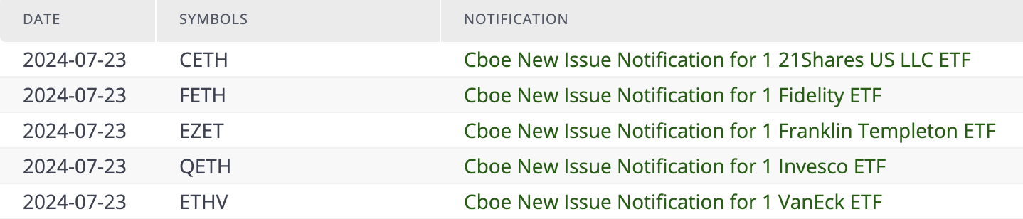 以 太坊现货 ETF 正式推出的预期在经过多次落空之后,目前看来下周 23 日的上市正逐渐成为现实。据芝加哥期权交易所(Cboe)官网资讯 显示 ,该平台已新增 VanEck、Invesco、Fidelity、21Shares、Franklin Templeton 等 5 档以太坊现货 ETF 资讯,预计𫔭放交易的时间就在 7 月 23 日。