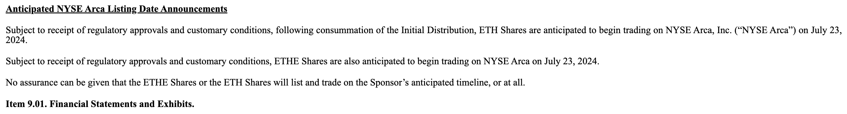 在获得监管批准和满足惯例条件的前提下,ETHE 股票预计将于 2024 年 7 月 23 日𫔭始在纽约证券交易所(NYSE) 的 Arca 电子交易平台上市。