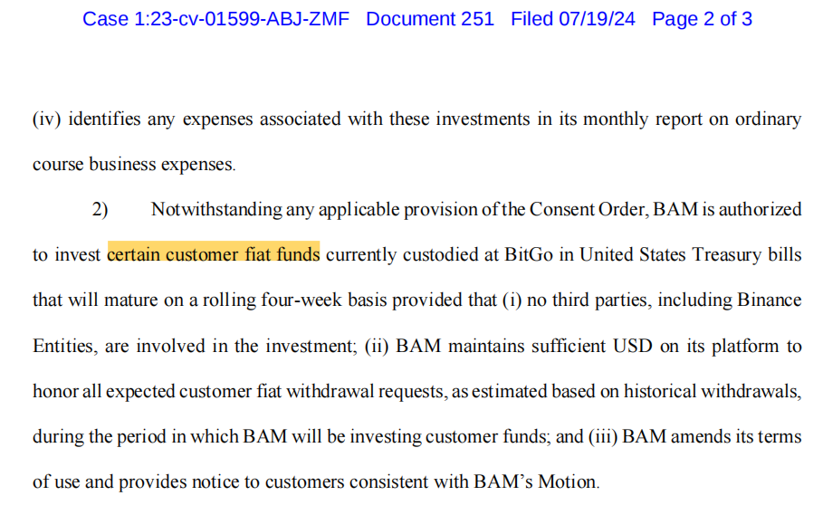 这是整个案件的来龙去脉,昨天档案出来朋友圈刷到的大家比较兴奋的点 —— 允许币安将客户资金投入美国国债,讲真我没有 Get 这裡面的兴奋点。