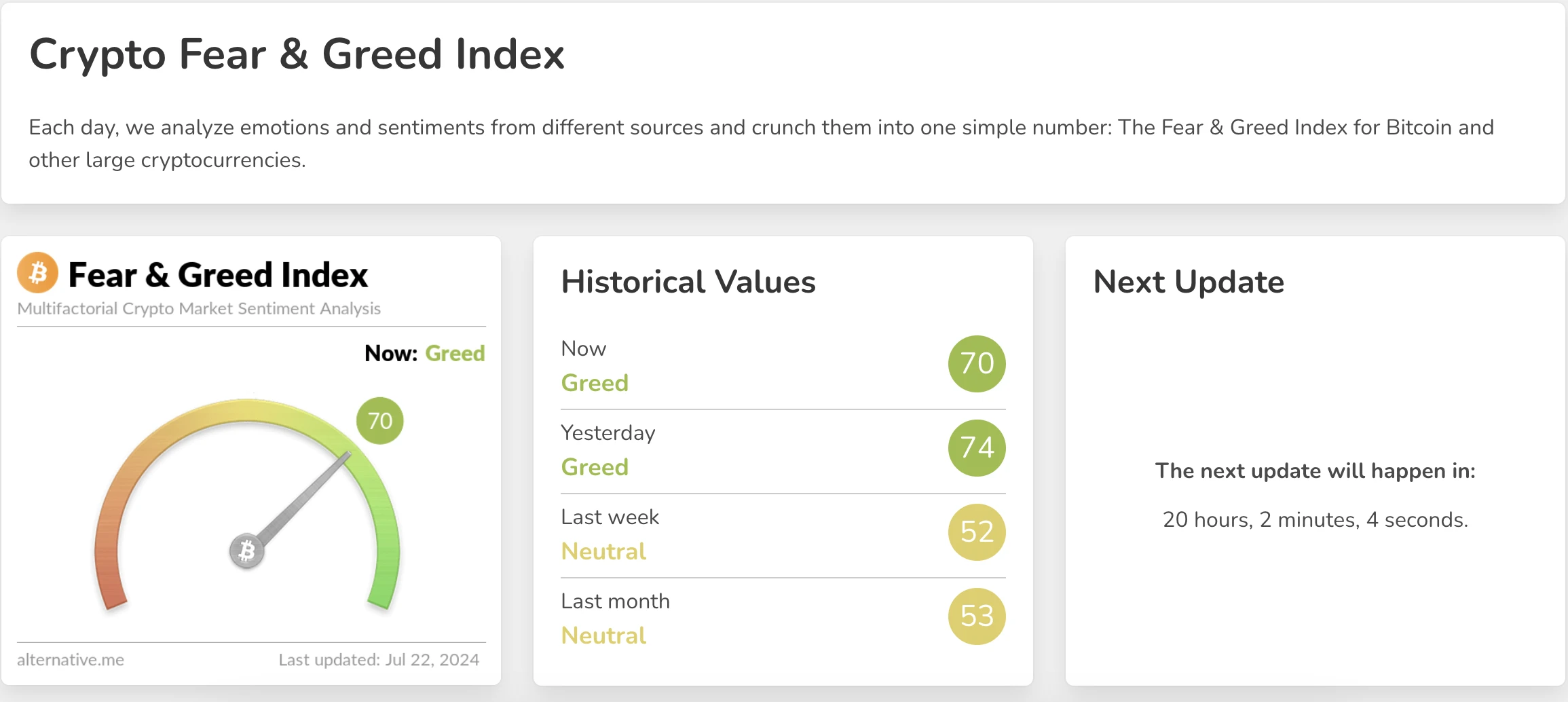 目前,市场恐慌与贪婪指数已从 7 月 12 日的 25 暴涨至 70 ,这说明尽管存在短期消息的利空“插针”,但目前市场看涨情绪较为高涨,而 9 月降息、ETH 现货 ETF 交易、JD Vance 成为共和党副总统候选人等事件或将成为驱动后市上涨的主要利好因素。
