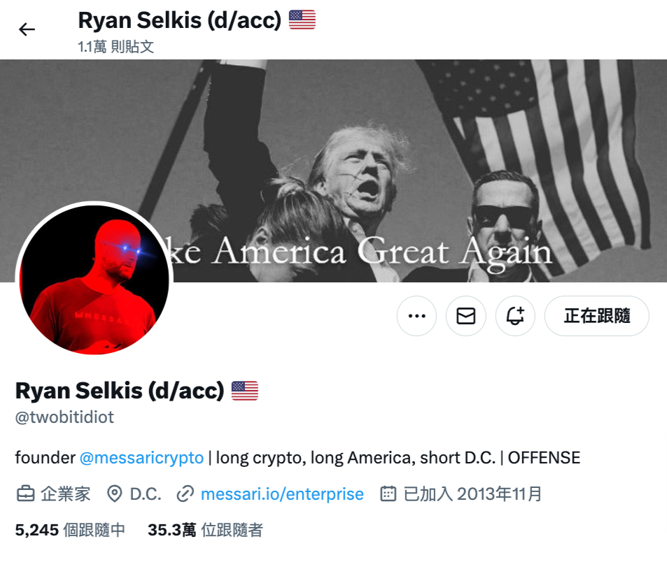 从传播性上,目前已经有非常多的大 V 换上了类似的红色基调+蓝色雷射眼照片,包括 Messari 创办人 Ryan Selkis (@twobitidiot)、 交易员 @Bluntz_Capital、@wsbmod、@wallstreetbets 等等,这肯定会成为这段时间一个持续不断的话题。