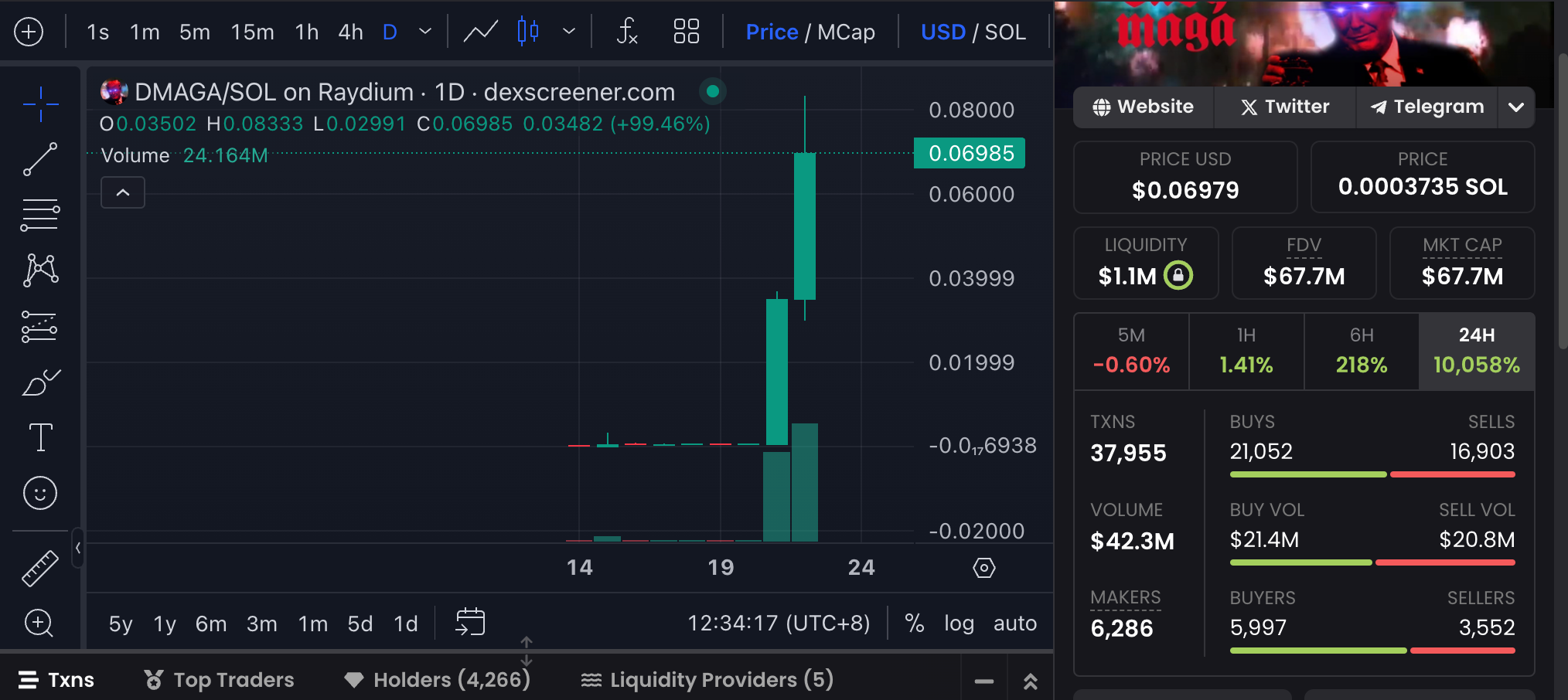 Dexscreener 数据 显示 ,$DMAGA 自昨日以来,从 0.0005325 美元的低点飙升至最高 0.08333 美元,期间暴涨超 15,548%,撰稿当下暂报 0.06979 美元,交易量突破 4250 万美元,近 24 小时涨幅高达 10,058%,成为今日涨幅最大的迷因币之一。