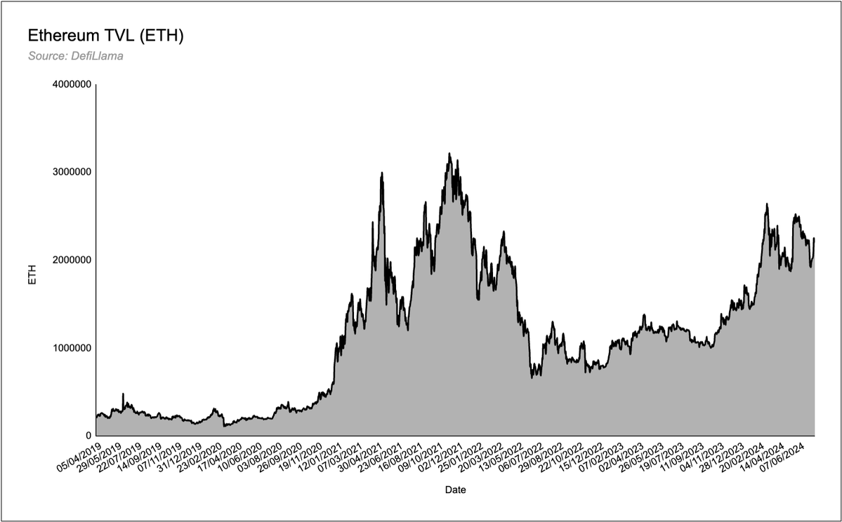 BTC ETF 缺少的一个重要因素是生态系统的“财富效应”。在新兴的比特币生态系统中,我们没有看到很多收益被重新投资到基础层的项目或协议中,尽管对 ordinals 和 inscriptions 有些小兴趣。以太坊作为一个“去中心化应用商店”,有一个完整的生态系统将从持续流入基础资产中受益。我们认为,这种财富效应没有得到足够的关注,特别是在 DeFi 领域。以太坊 DeFi 协议中有 2000 万 ETH(630 亿美元)的锁定总价值 (TVL),随着 ETH 价格上涨,ETH DeFi 变得更具吸引力,因为以美元计的 TVL 和收入激增。ETH 具有比特币生态系统中不存在的反身性。