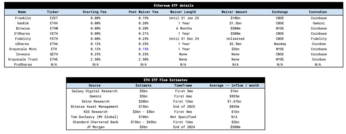 ETF 的费用结构与 BTC ETF 类似。大多数提供商在指定期间内免收费用,以帮助积累资产管理规模(AUM)。与 BTC ETF 类似,Grayscale 将其 ETHE 费用维持在 2.5% ,比其他提供商高出一个数量级。这次的关键区别在于引入了 Grayscale mini ETH ETF,这在之前的 BTC ETF 中并不存在。