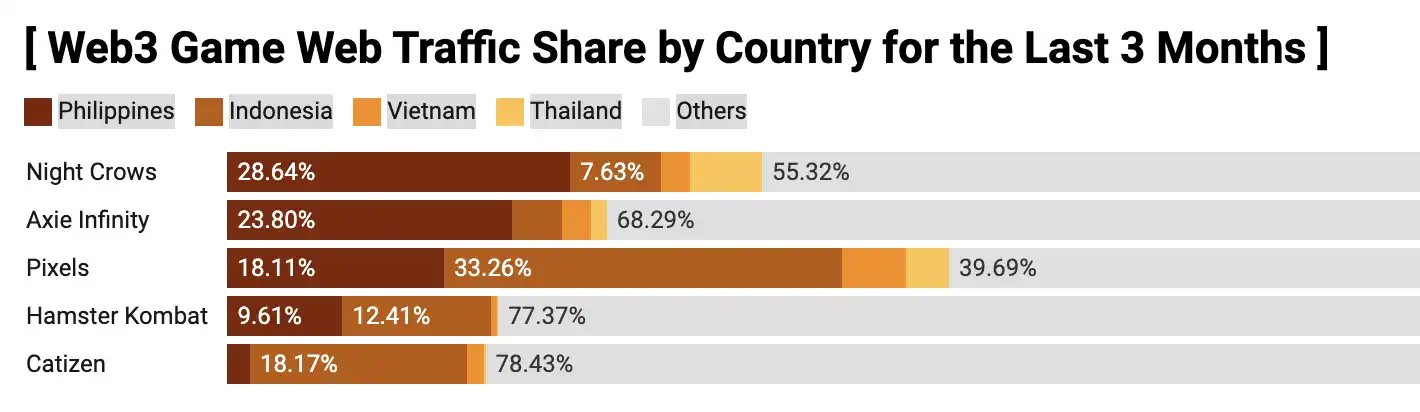 然而,尽管有所下降,东南亚仍然占据了 Web3 游戏用户的显著比例。不可否认市场呈现下降趋势,但东南亚玩家参与最近发布的 Web3 游戏的比例仍然很高。实际上,对过去三个月主要 Web3 游戏的网站流量分析显示,菲律宾和印度尼西亚等国家继续构成核心用户基础。