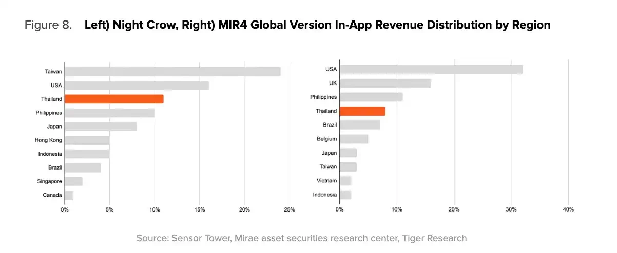 这进一步推动了东南亚成为游戏公司不可忽视的重要市场,因为该地区的 Web3 游戏显示出了较高的游戏内购买率。尽管东南亚通常被认为是购买力较低的地区,但 Web3 游戏却在这里展现出了积极的支付趋势,带来了显著的应用内购买量。特别是在菲律宾和泰国,WeMade 公司的 Night Crow 和 Mir 4 在应用内收入排名中分别位列第三和第四,凸显了这一市场的潜力。总体来看,东南亚的 Web3 游戏市场是一个充满机遇与挑战的复杂而充满活力的市场。