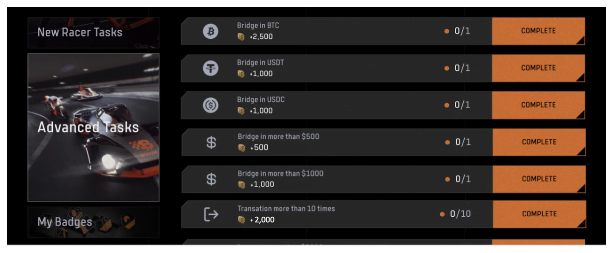 Bitlayer 为那些对整个生态有一定了解的赛车手特别设置了进阶任务,这些任务将以“里程碑”的形式展现。当用户在生态中的活跃度(如资产跨入、交互次数等)达到特定里程碑时,他们将一次性获得大额积分奖励。