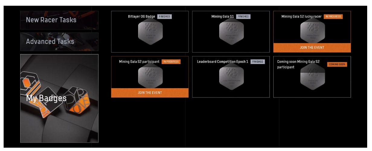 勋章墙是用户加入 Bitlayer 生态后的成就展示中心,每一枚勋章都是用户在 Bitlayer 生态中努力与参与的见证。在 Bitlayer 生态中,每一位用户将以赛车手的角色活跃,勋章墙将记录用户在生态中的点点滴滴,包括交互贡献、参与各类活动获取的奖励等信息,并以荣誉勋章的形式进行展示。