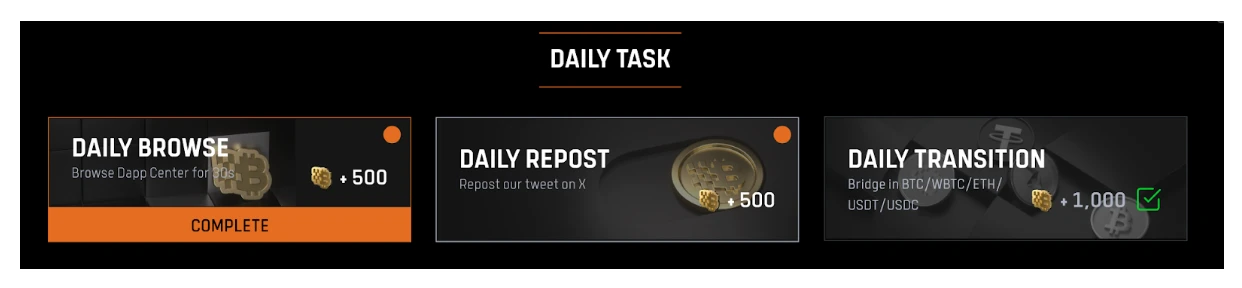 日常交互任务是用户中心的核心组成部分。新手任务和进阶任务均为一次性挑战,Bitlayer 为用户提供了每日互动任务,完成任务即可持续积累积分。