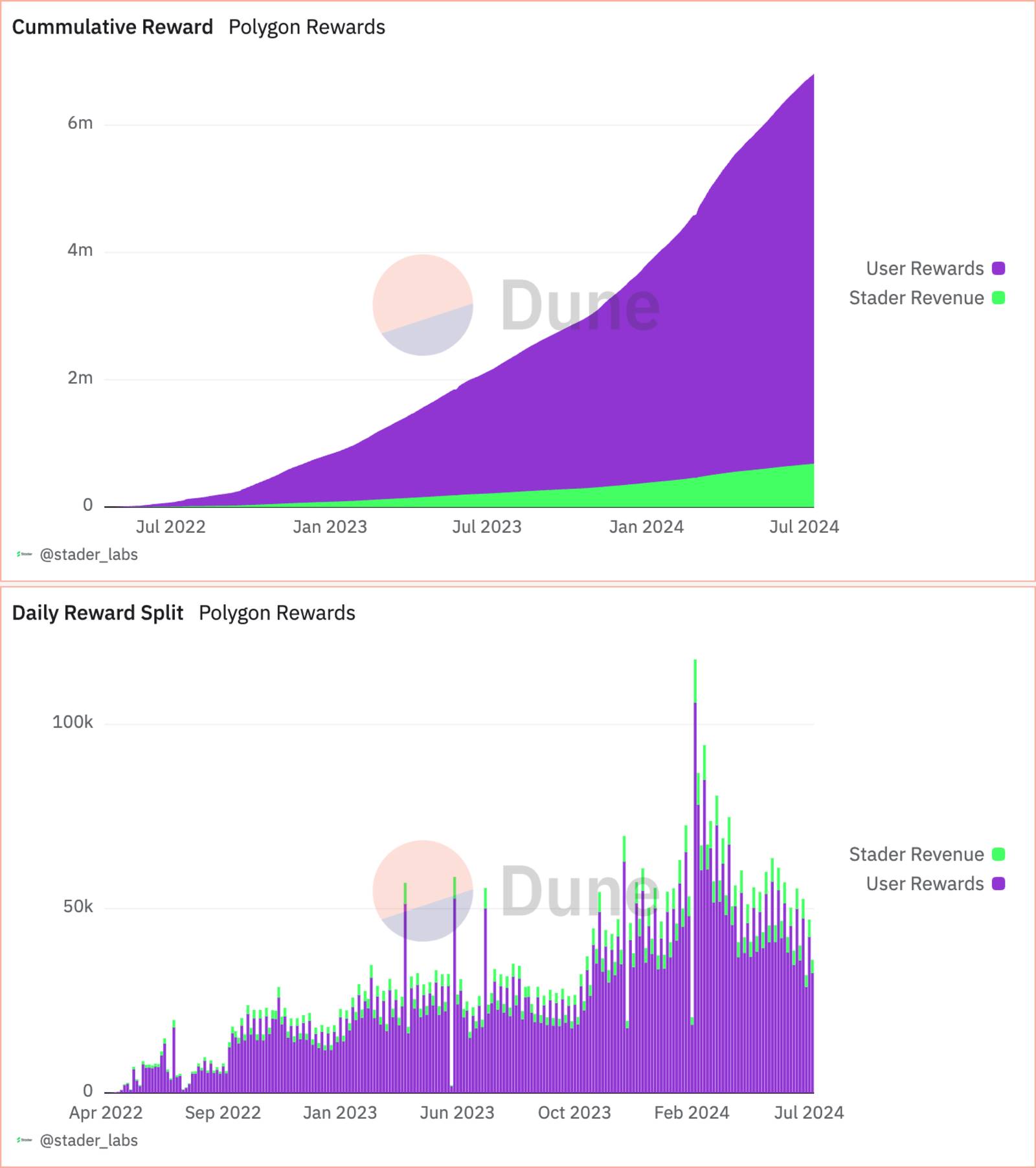 MaticX TVL、奖励和收入:Stader Labs 是 Polygon 上领先的流动性质押代币 (LST),TVL 超过 1.54 亿 Matic。它已向用户分发了 6, 128, 781 美元的奖励。这些奖励通过 ETH 合约管理,Stader 获得了 10% 的份额(680, 976 美元)。自 2022 年 7 月以来,Stader 一直表现出持续增长。