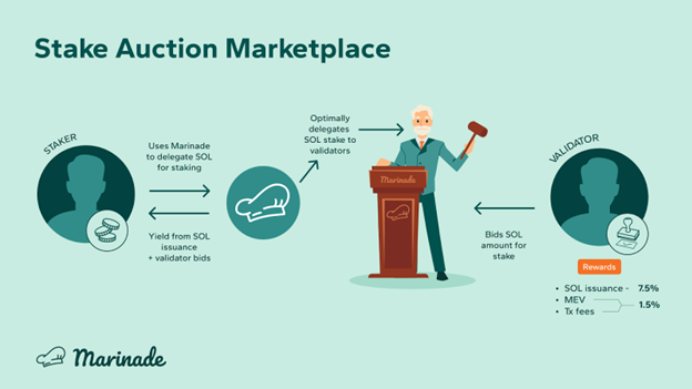 质押拍卖市场 (Stake Auction Marketplace, SAM) 是 Marinade v2 的一个重要功能,它为验证者之间的质押创建了一个公开拍卖平台。这使得 Marinade 上的质押者可以获得优先费用,如 MEV 提示和交易费用,这些以前仅对验证者开放。