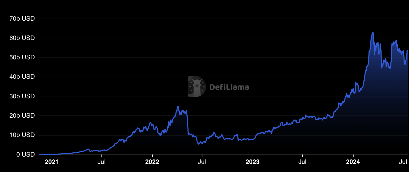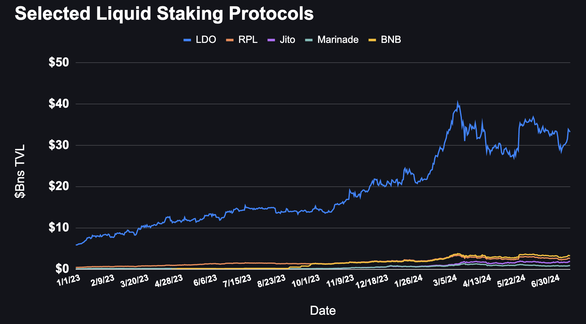 流动性质押是加密货币中最常用的功能之一,允许用户开启 DeFi 选项。随着越来越多的权益证明区块链启动,几乎立即就会出现流动性质押解决方案,为用户提供质押方式的灵活性。由于新链的启动、ETH 价格的上涨以及更多用户使用流动性质押代币 (LSTs),流动性质押市场的总锁定价值 (TVL) 已超过 500 亿美元。过去一年中,Solana、TON 和 Ethereum 上的流动性质押流量显著增加。