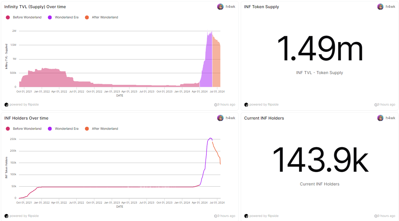 即使活动已经结束, INF 代币 在 Sanctum 用户中仍然很受欢迎。目前,INF 的供应量保持在约 150 万,有超过 14 万持有者。两个数字在第一季结束后略有下降。Wonderland 第二季的公告表明其将在今年晚些时候发布。