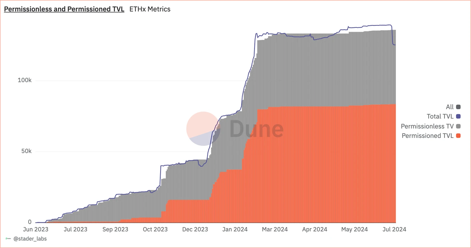 ETHx TVL 和存款:Stader Labs 是一个非托管质押平台,为多个权益证明 (Proof-of-Stake) 网络上的用户提供流动性和安全性。Stader Labs 在 ETHx 上的总 TVL 为 Ξ 125, 293 (约 3.86 亿美元),在信标链上存入了 Ξ 135, 872 (包括节点操作员的 9, 000 多 ETH 保证金)。这种大规模参与反映了机构和用户对 Stader 质押解决方案的强烈信心,由无许可和有许可的 TVL 组合驱动。