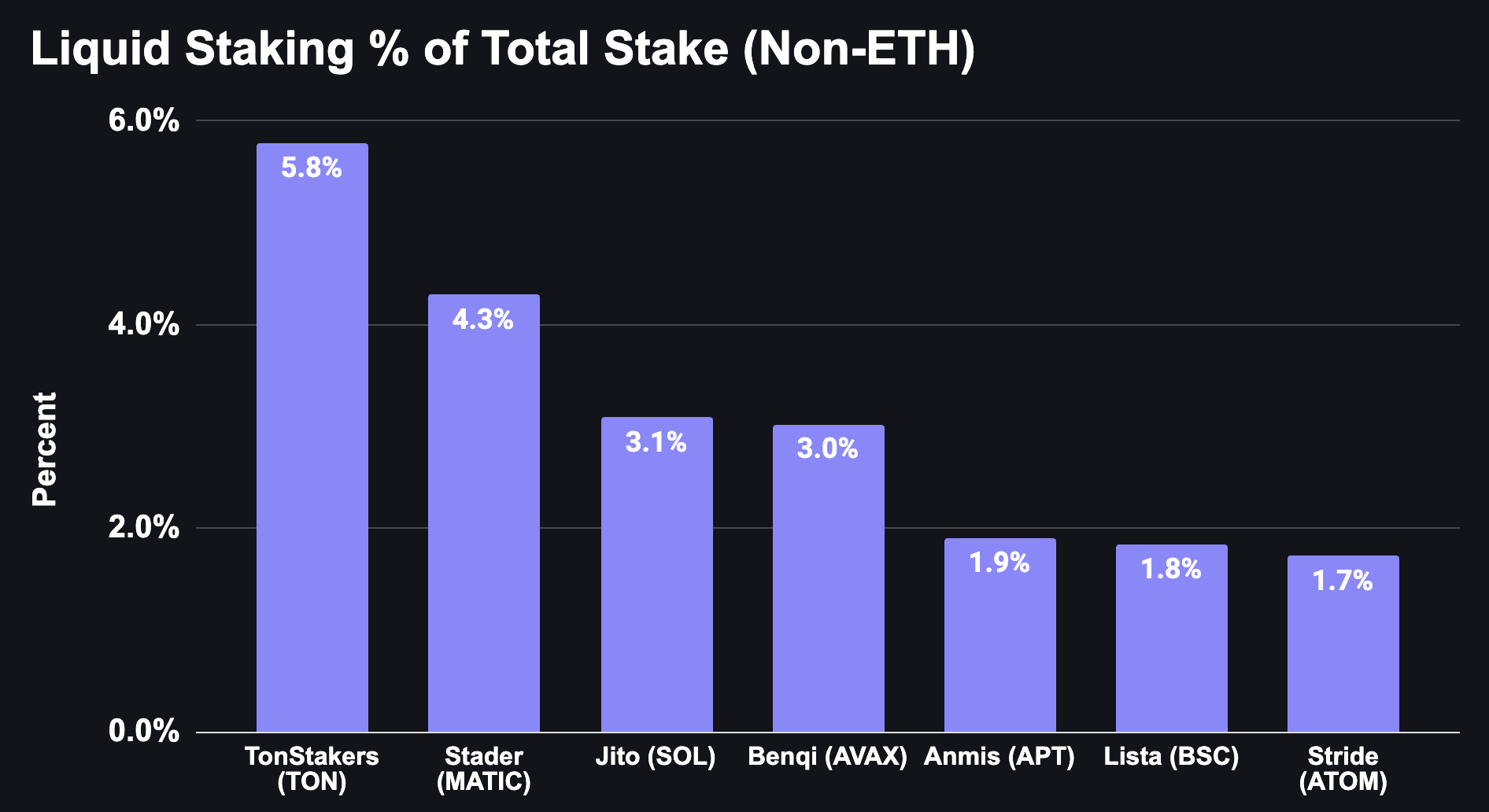 在 Ethereum 之外,流动性质押提供商的渗透率仍然较低,有很大的增长空间。TONstakers 质押了几乎 6% 的所有 TON,表明对 TON 质押产品的需求显著。Solana 质押产品在过去一年中有显著的流入,但总质押比例仍然较低。